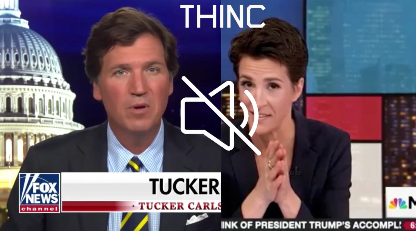 THE LISTENING PARTY would also have it’s own Twenty-four Hour Inaudible News Channel (THINC) showing a split screen of FOX and MSNBC, but set to mute with no way of turning the sound on. This allows viewers to see politics as the ceaseless circus it has become.